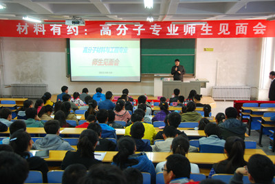 在见面会上,各位老师分别发言。王庆明副书记在开幕辞中鼓励同学们应该在大学中学会自我教育、自我管理、自我发展、自我服务、自我培养。刚从美国访问归来的陈振斌教授与同学们分享了他在美国的科研经历和对高分子专业发展的期望。高分子副主任李慧副教授给全体同学介绍了专业的师资力量和科研现状。其他专业老师分别介绍了各自的科研方向,并欢迎有兴趣的同学们积极参加他们的课题组。最后,11级学生代表向低年级同学分享了他们的保研、考研和找工作的经验,同学们在会后与专业老师及学长学姐们积极交流,收获颇丰。